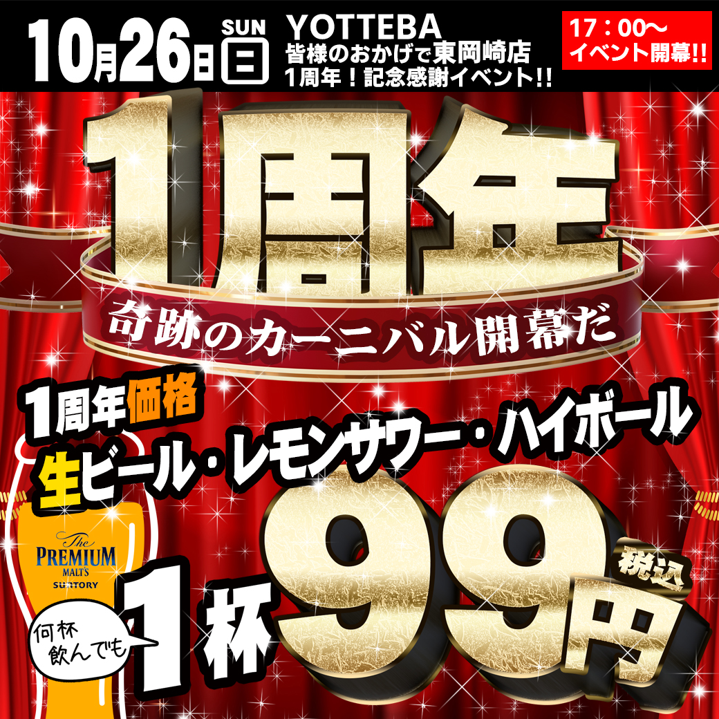 日頃より酔っ手羽に格別のご愛顧をいただきありがとうございます。 おかげさまで、2025年10月26日(日)に、居酒屋革命 酔っ手羽 東岡崎店がオープンから1周年を迎えます。 当日は、日頃のご愛顧への感謝を込 […]