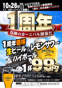 当日は、日頃のご愛顧への感謝を込めて、2025年10月26日(日)17:00~22:00の時間限定で、レモンサワー、ハイボール、生ビールを99円でご提供いたします!