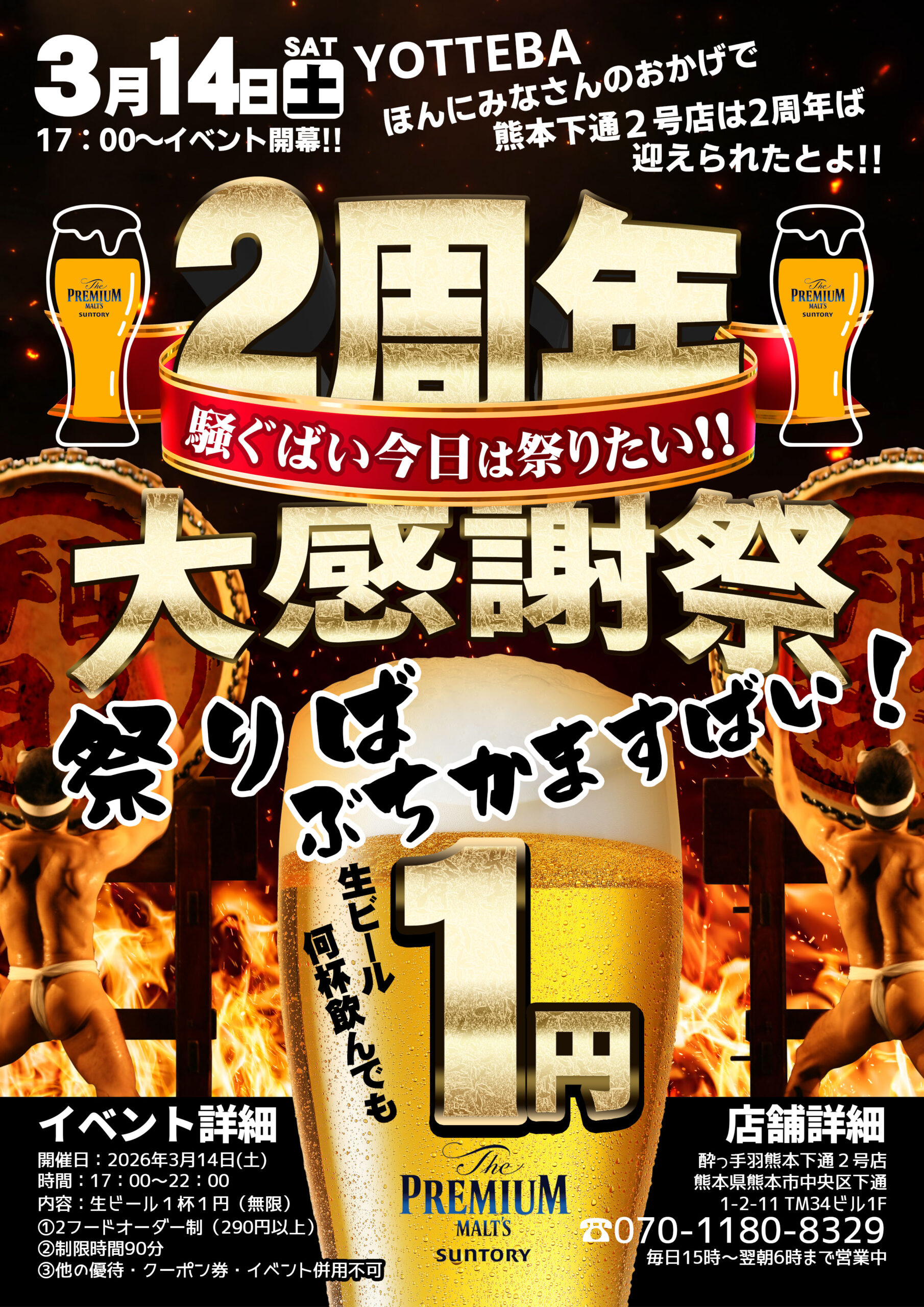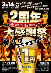 当日は、日頃のご愛顧への感謝を込めて、2026年3月14日(土)17:00~22:00の時間限定で、生ビールを1杯1円でご提供いたします!