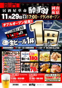 11月29日(土)17時に、居酒屋革命 酔っ手羽 岡山西口店がオープンします。