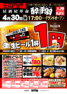 4月30日(木)17時に、居酒屋革命 酔っ手羽 天神西通り店がオープンします。